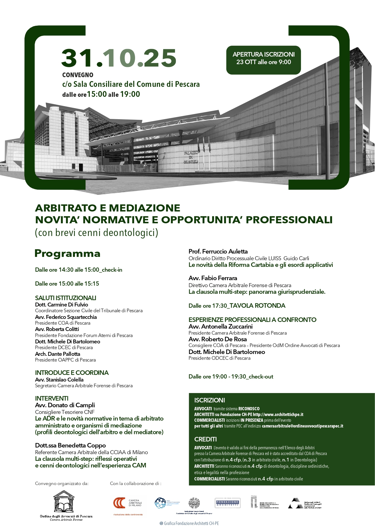Siamo lieti di comunicare che l’Ordine degli Architetti di Pescara e la Fondazione Architetti di Chieti-Pescara hanno stipulato una convenzione con la Camera Arbitrale Forense di Pescara con l’obiettivo di promuovere e diffondere la cultura dell’arbitrato.